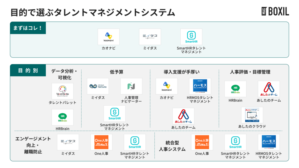 タレントマネジメントシステムを選ぶときは、導入の目的にあわせて候補を絞るとよいでしょう。なかでも、導入者数の多いカオナビ、ミイダス、SmartHRタレントマネジメントがおすすめです。