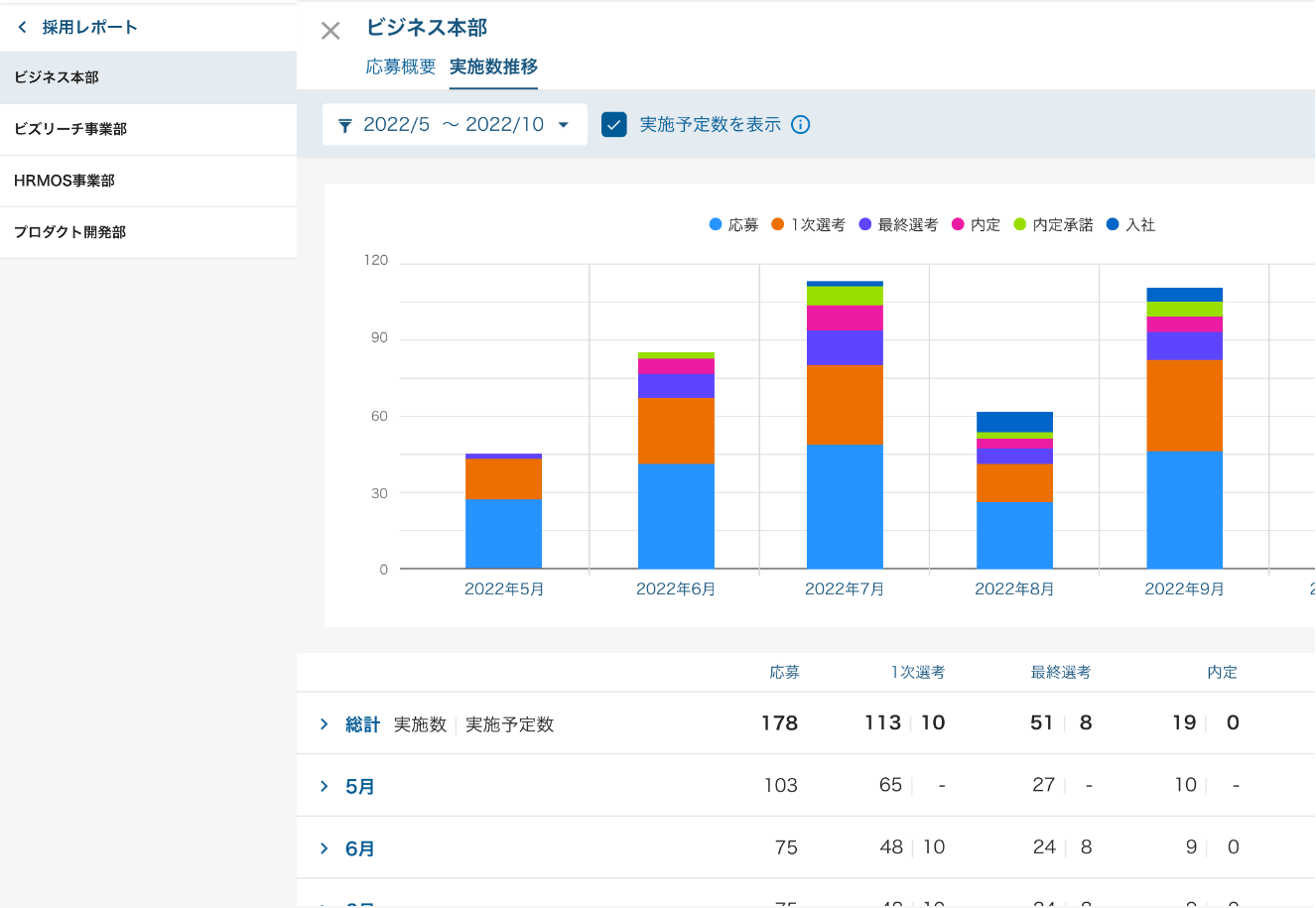求人別・経路別レポートでは、選考ステップごとの採用進捗を確認でき、採用プロセスのボトルネックや辞退・内定理由の傾向を把握できます。目標対実績レポートでは、採用決定人数に対する充足率をリアルタイムで確認でき、過去実績と比較しながら採用計画を適宜修正可能です。