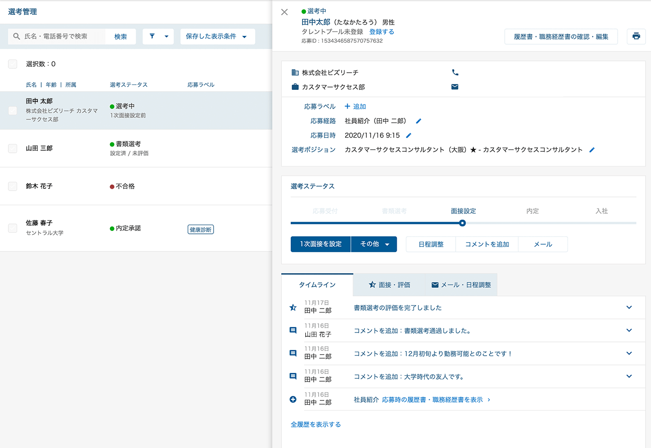 候補者情報を一元化して管理でき、面接日程の調整や選考進捗を即座に把握できるのが特徴です。GoogleカレンダーやWeb面接ツールと連携し、HRMOS採用上の画面から面接日程の調整やWeb面接用URLの発行・送信までまとめて行えます。候補者ごとの評価情報やコメントも一つのプラットフォーム上で確認できるため、複数の面接官同士での情報共有もスムーズに行えます。