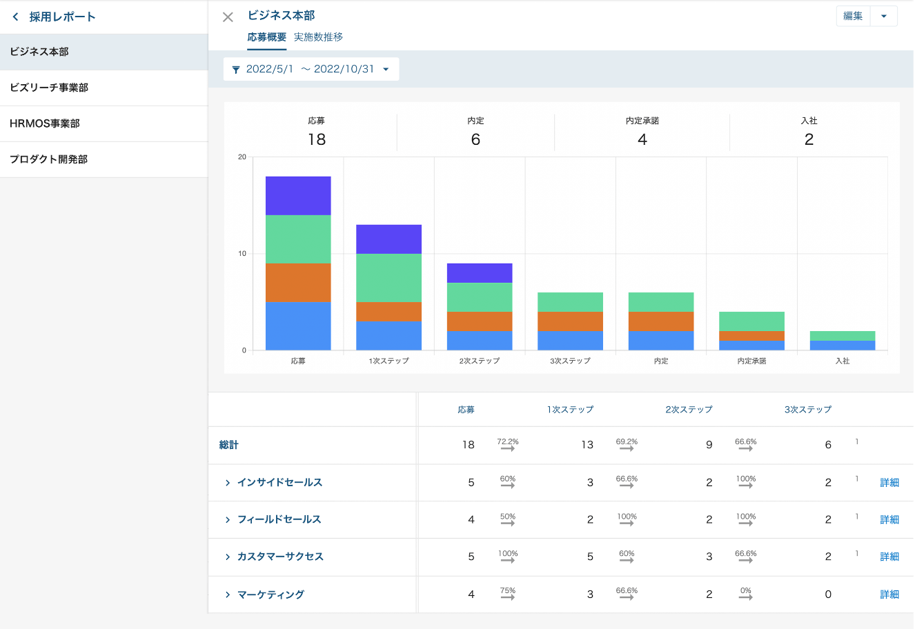 媒体別の応募数や通過率などを分析できるレポート機能も充実しており、どの採用チャネルが効果的かを容易に把握できるのも特徴です。