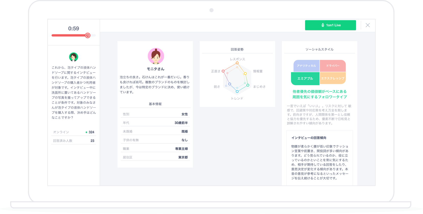 【役立った機能面】 スクリーニングをして10分もあればインタビューをする相手とマッチングできて、すぐにインタビューを開始できるので手軽で助かります。 【操作性・使いやすさ】 UIはユーザー目線で操作しやすいデザインで、コスト面でもリーズナブルな価格で利用できるので予算への負担が少ないです。