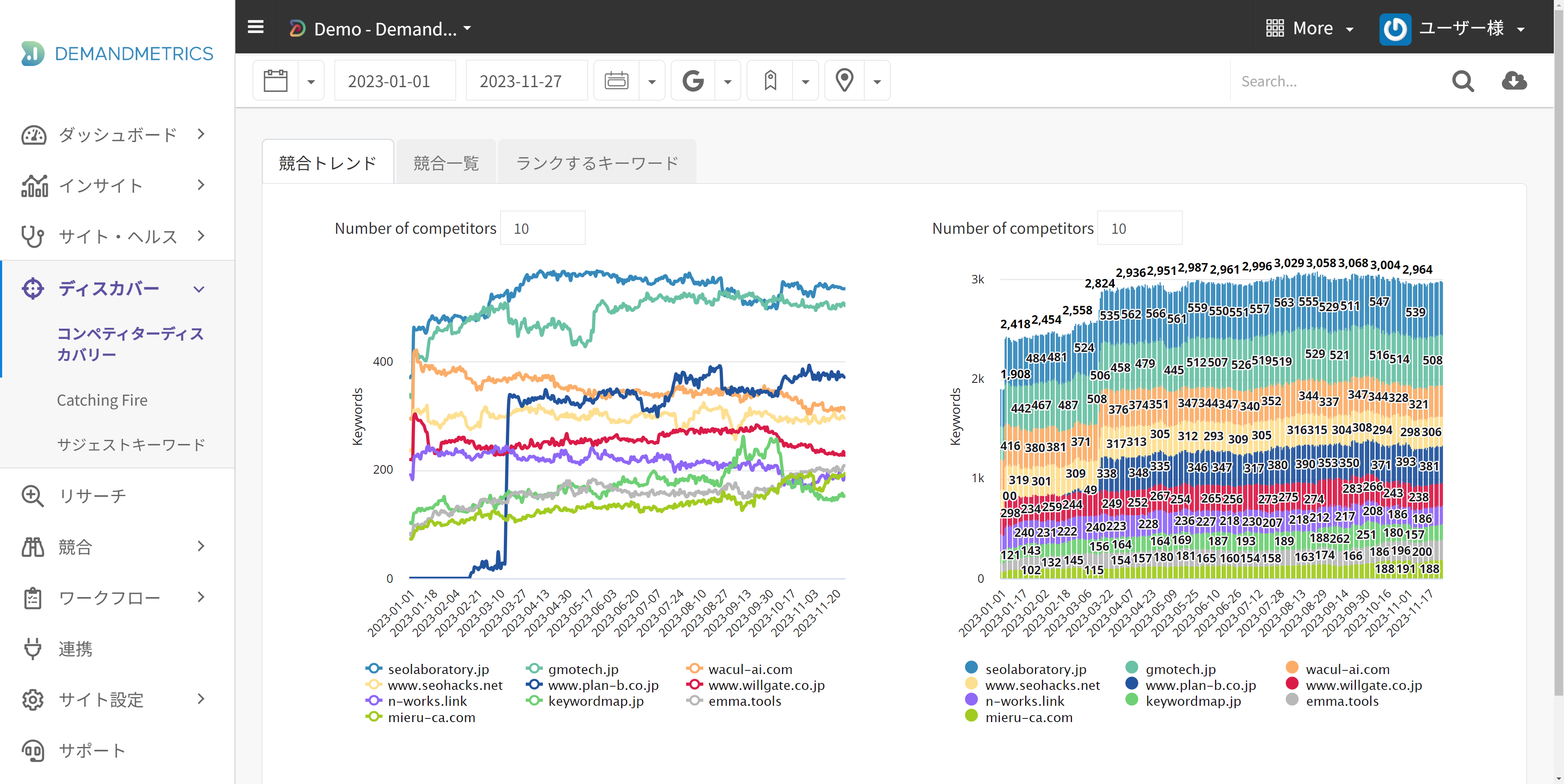 大規模なサイトを運用する場合、かなりの量のキーワードを分析する必要がありますが、他ツールだとそのボリュームに十分に対応していなかったり、上位件数しか見られない場合があります。本サービスは大量のキーワードにも対応しているため、集客の大きいサイトで細かく分析をしたいユーザーに適したサービス形態だと思います。