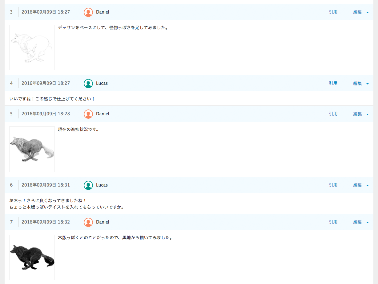 制作物はアイテムといった単位で管理/集約され、アイテムごとにやりとりがスレッド化されます。制作物ごとにプロセスや進行の流れを可視化できるほか、やりとりも集約可能です。