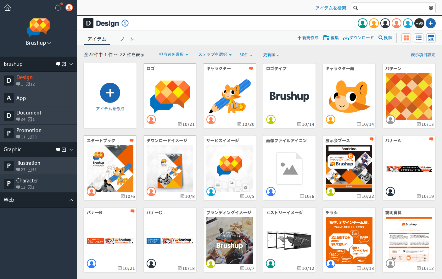 Brushup (ブラッシュアップ) は、チラシ、カタログ、パッケージ、漫画、教材、イラスト、動画、Webコンテンツなど、さまざまな制作物のやりとりを圧倒的に効率化するコミュニケーションプラットフォームです。