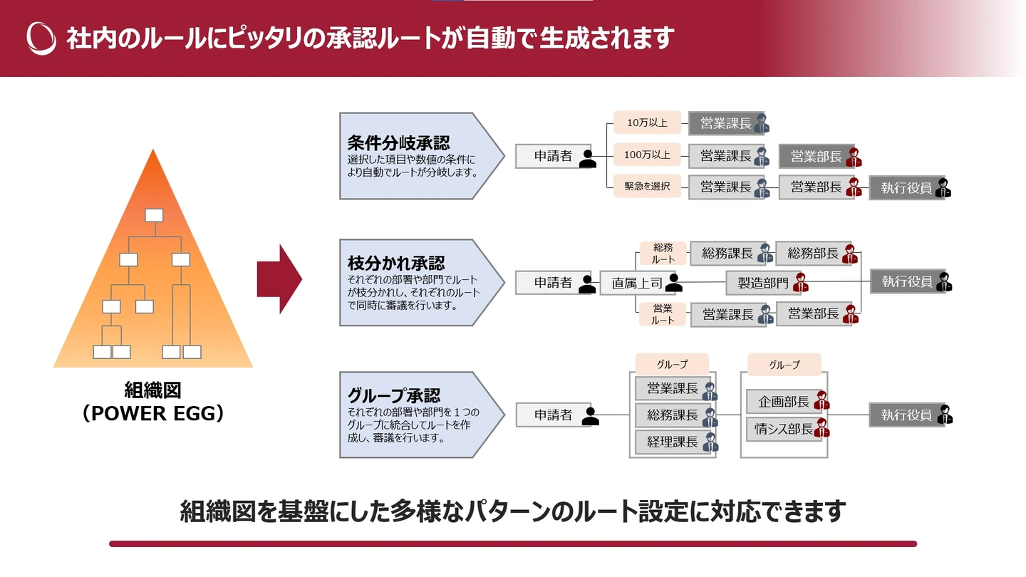 POWER EGGのおすすめポイントは、任意の組み合わせで各アプリケーション便利に使用でき、ワークフローだけでなく、オフィス業務をトータルで効率化できる点です。 グループウェア、汎用申請ワークフロー、Webデータベース、CRMの機能を搭載。それぞれ必要な機能を任意の数量だけ導入できます。 申請ワークフローでは、ノーコードで簡単に申請フォームを作成・編集できるので、現場主体でスピーディーに準備が行えます。色付きの必須入力項目や自動計算項目、カレンダーによる日付選択など、申請者が困らない補助機能も備わっています。またWebデータベースを使えば、承認後の台帳入力や期日管理、集計業務など、決裁後の業務までを自動化でき、作業負担の大幅な軽減につながります。 ワークフローをはじめとした多数の機能を、1つのサービスで導入したい企業におすすめです。