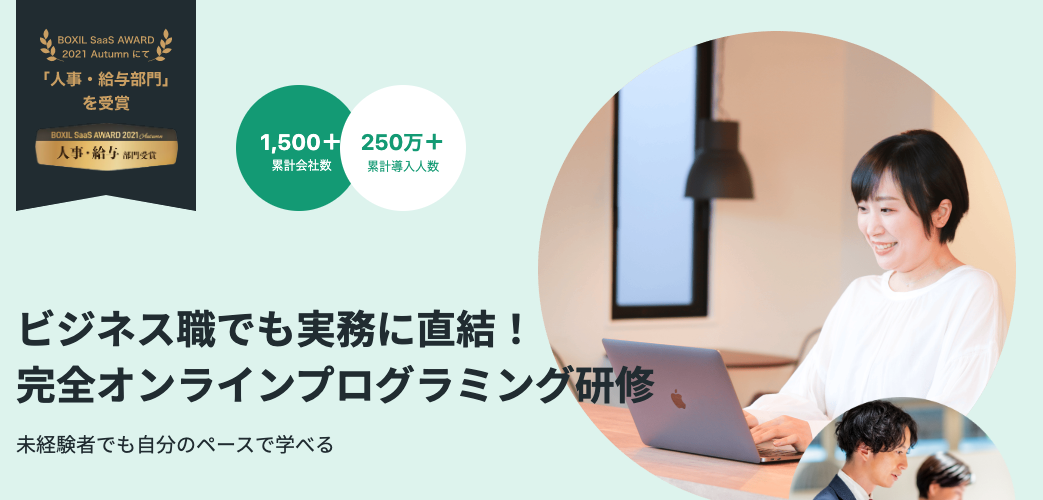 エンジニアの新人研修にはもちろん、営業やマーケター、人事や経理などのビジネス職のリスキリング・プログラミング研修・DX研修などにもおすすめです。