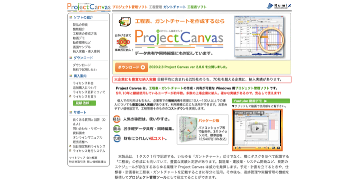 Project Canvasは工程管理・プロジェクト管理などに使用する、ガントチャートの作成ツールとして利用するソフトウェアです。特に操作が簡単で分かりやすいことに定評があります。また、5年、10年と長年継続使用しているユーザーが約半数を占めており、確かな実績を持っているため、安心して利用することができます。