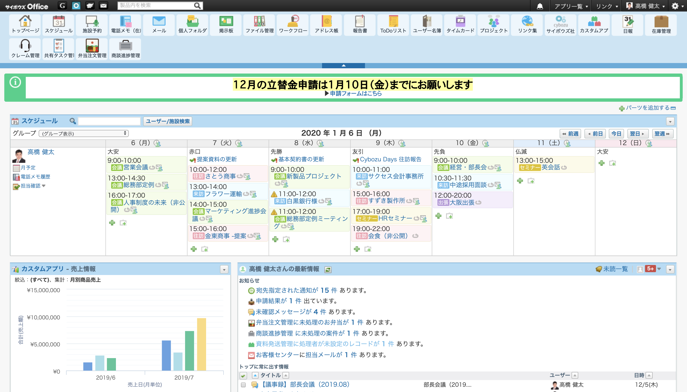 サイボウズ Officeにログインすると最初に表示される「トップページ」では、その日の予定や、自分宛の連絡・申請などをまとめて確認できます。ユーザーごとに表示内容をカスタマイズすることもできるので、自分が見たい情報を1画面に集約できます。