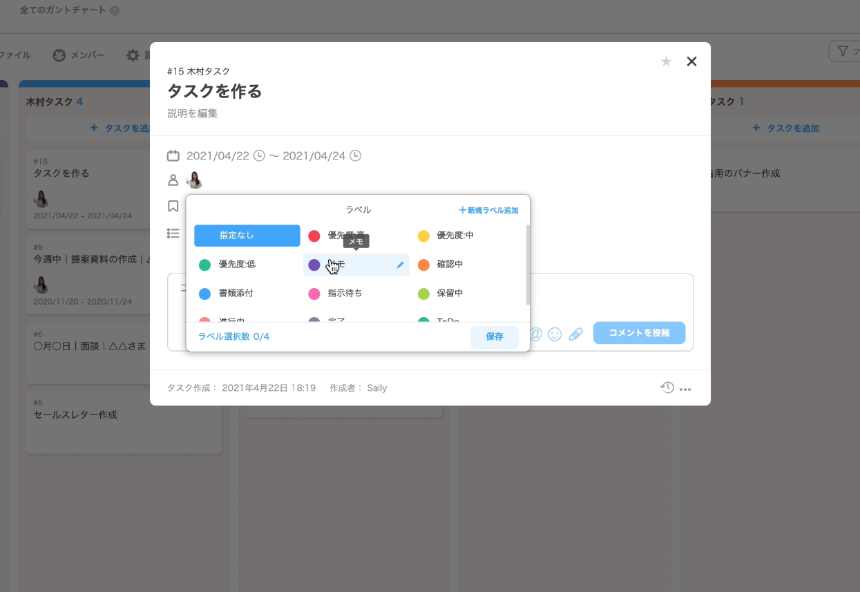 各タスクをカードとして作成し、担当者、期限、進捗ステータスを明確に設定できます。