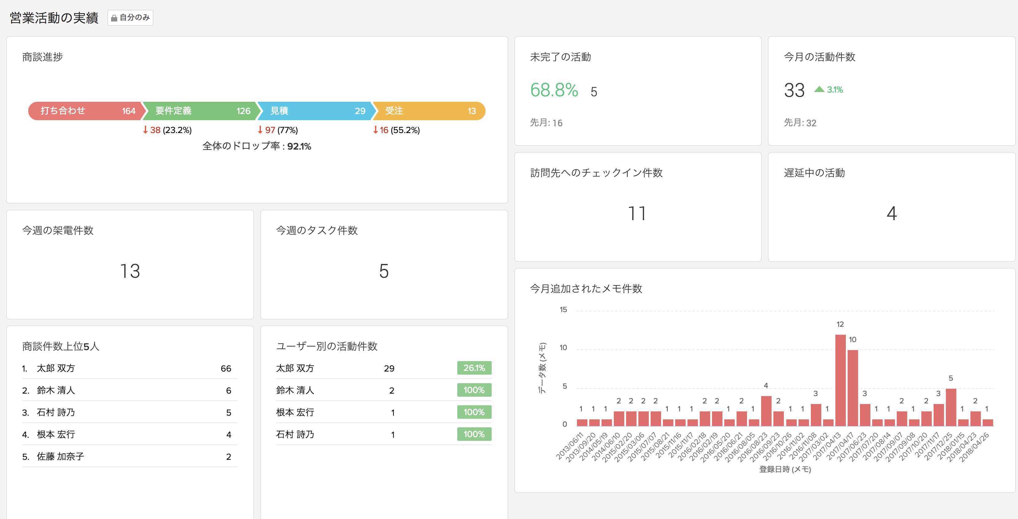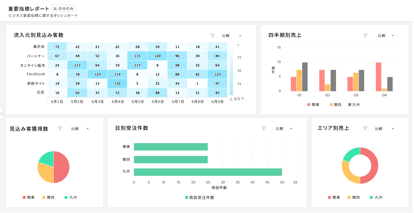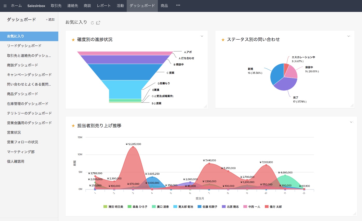 高いカスタマイズ性で柔軟な顧客管理システムです。自社の業務フローに合わせて最適化することができます。営業プロセスの管理や実績の可視化において非常に強力で、ダッシュボード機能がリアルタイムに業績を把握する分析力が大きなメリットです。多様なニーズに対応できる点が魅力と言えます。