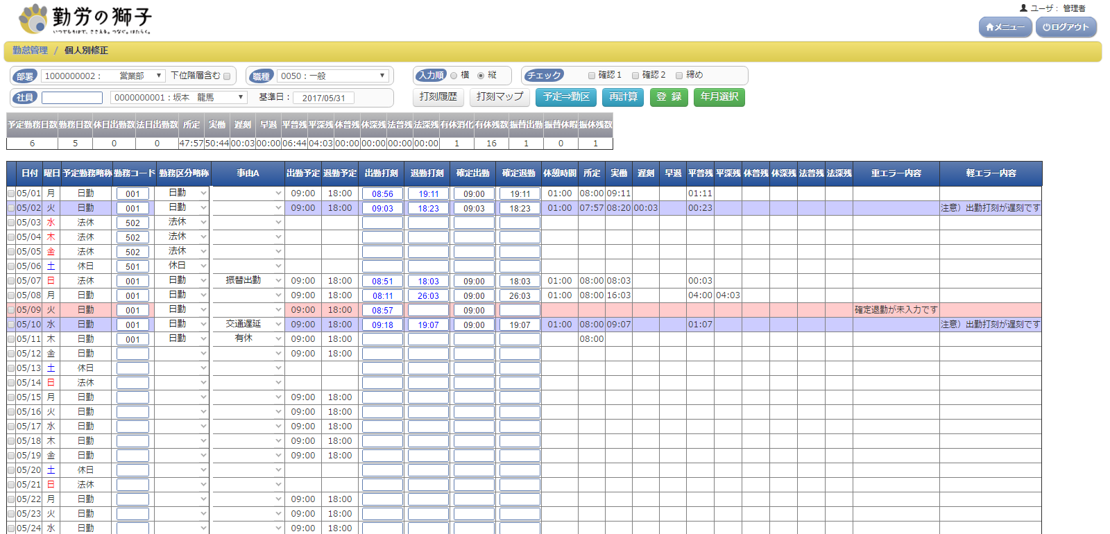 一般社員に関しては勤務時間・実績の報告、有給残数等の確認画面として使用しています。