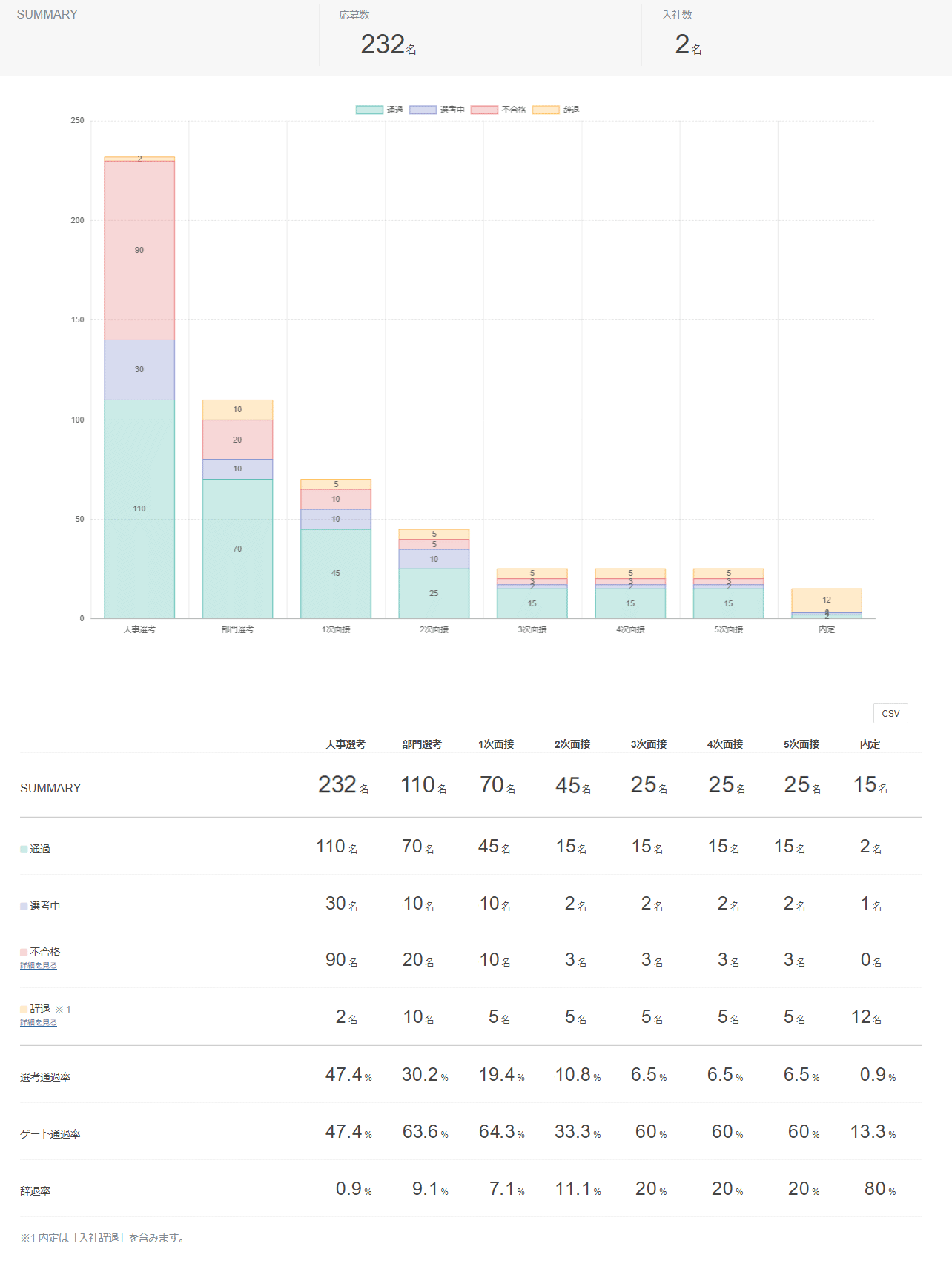 A JobSuite CAREERの選考管理機能では、ダッシュボードで日々の業務タスクを把握しながら、応募者情報を条件検索・保存でき、応募者ごとの選考進捗や履歴を一覧・時系列で管理可能です。 複数応募者への一括メール送信やステータス変更にも対応し、タグ付け機能で絞り込み条件として活用できます。応募者情報はPDFレジュメとして出力できるため、面接現場での資料としても利用可能です。Q どのようなレポートや分析ができますか?