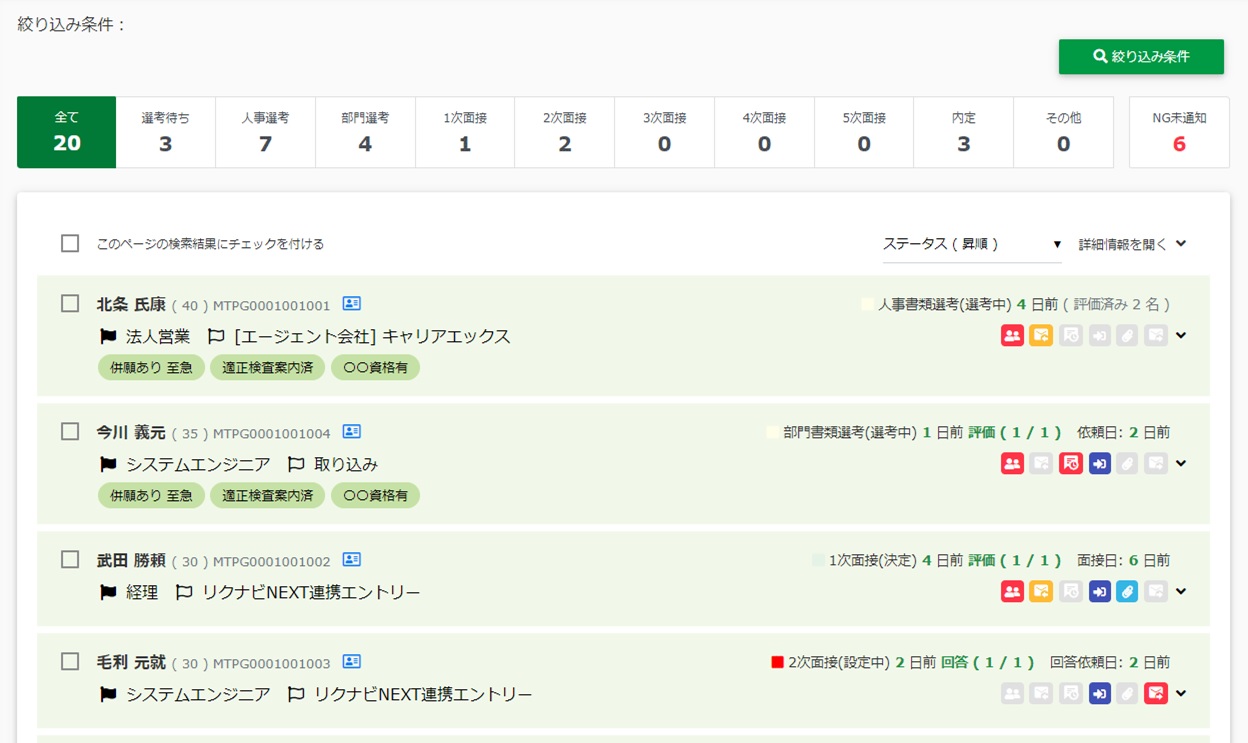 採用担当者向けのダッシュボード機能も用意されており、採用プロセスの進捗を一目で把握できます。候補者リストはステータス別に色分け表示され、対応優先度の高い応募者が直感的にわかります。