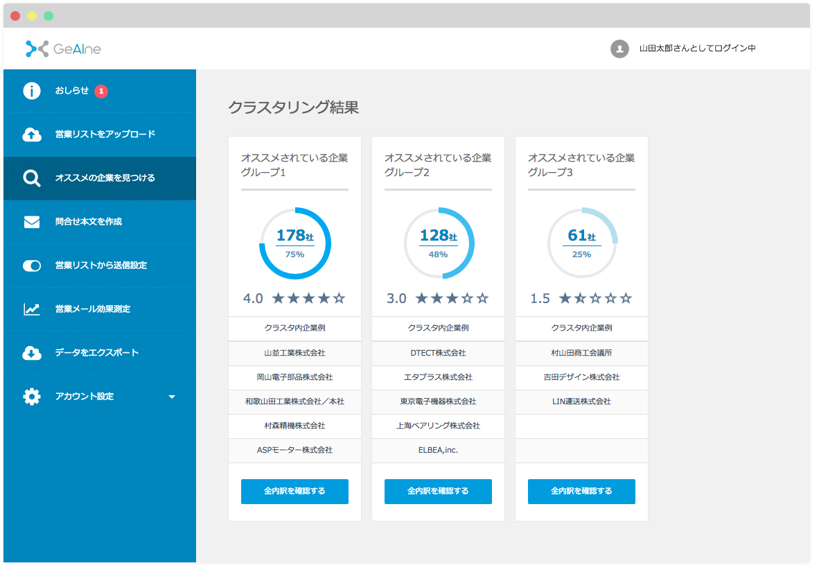 GeAIneは多くの企業リストを抱えており、リストの中から自社のターゲットである企業へアプローチができます。