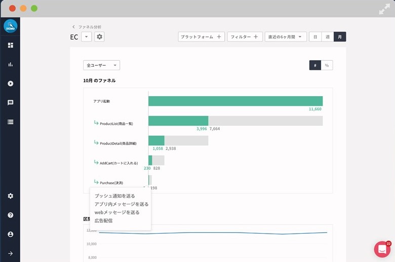 アプリ内のユーザーを行動履歴や属性情報からセグメンテーションすることができ、セグメントごとに時間や内容を変えたプッシュ通知を行うことができています。 UIのデザインもシンプルで、初めて利用するメンバーからも使いやすいと好評です。