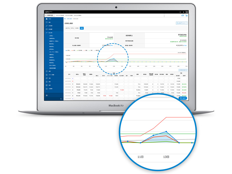 店舗、商品、時間など様々な軸での売上分析が可能 。リアルタイムで売上を確認できます。