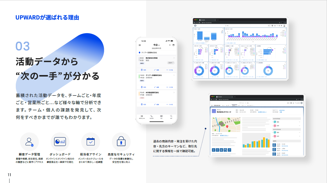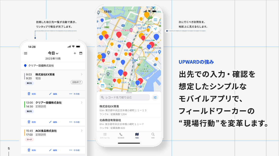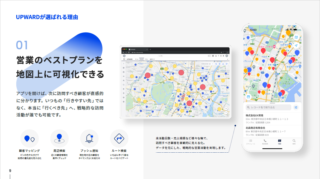 UPWARDは、“営業活動のパートナー”として、セールスパーソンの現場での営業活動を支援し、売上を伸ばすDXツールを提供しています。
