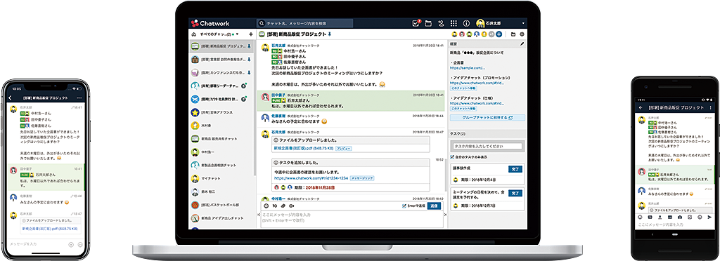 専門スキルや高いITリテラシーがなくとも、簡単に安全に使うことができます。コミュニケーションの活性化はもちろんのこと、画像やファイルの共有、タスクや納期の管理なども「Chatwork」ひとつで実現します。