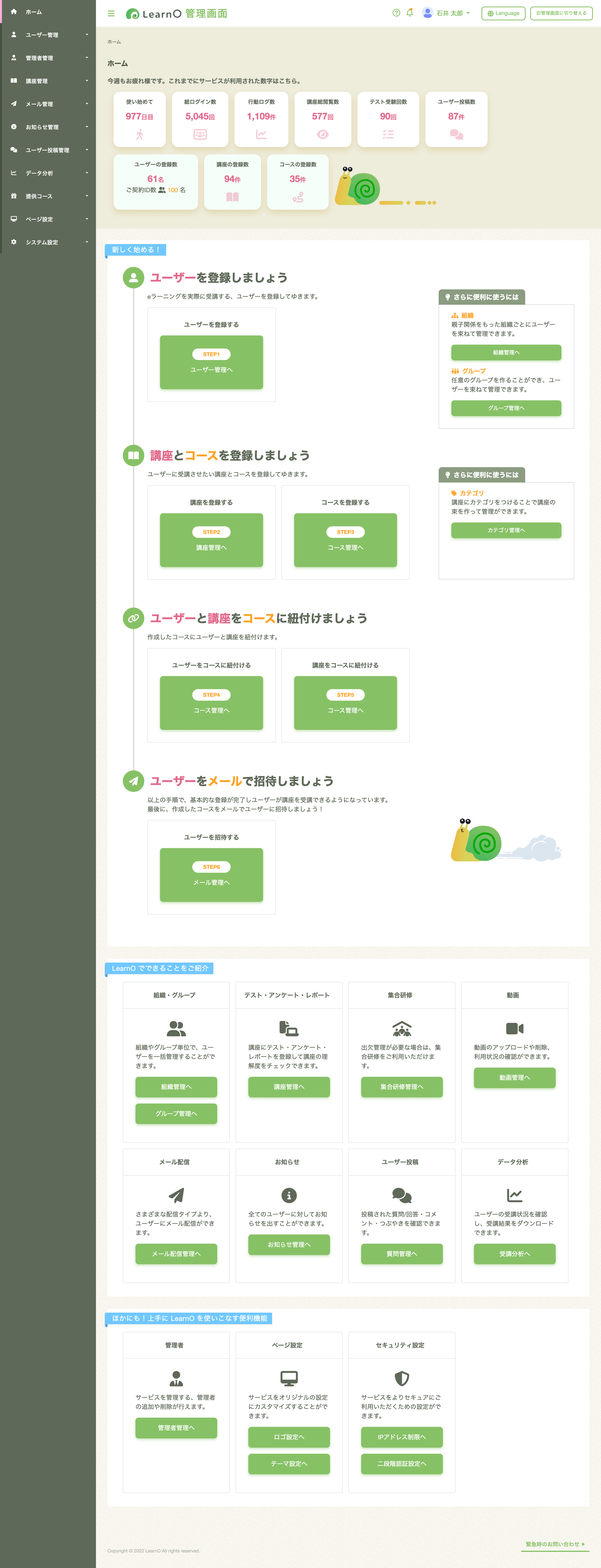 A LearnO管理画面より各受講者の受講履歴やテスト結果を細かく確認することができます。 未受講者へメールを配信して受講を促す機能もございます。Q LearnO ではテストやアンケートを作成することはできますか?