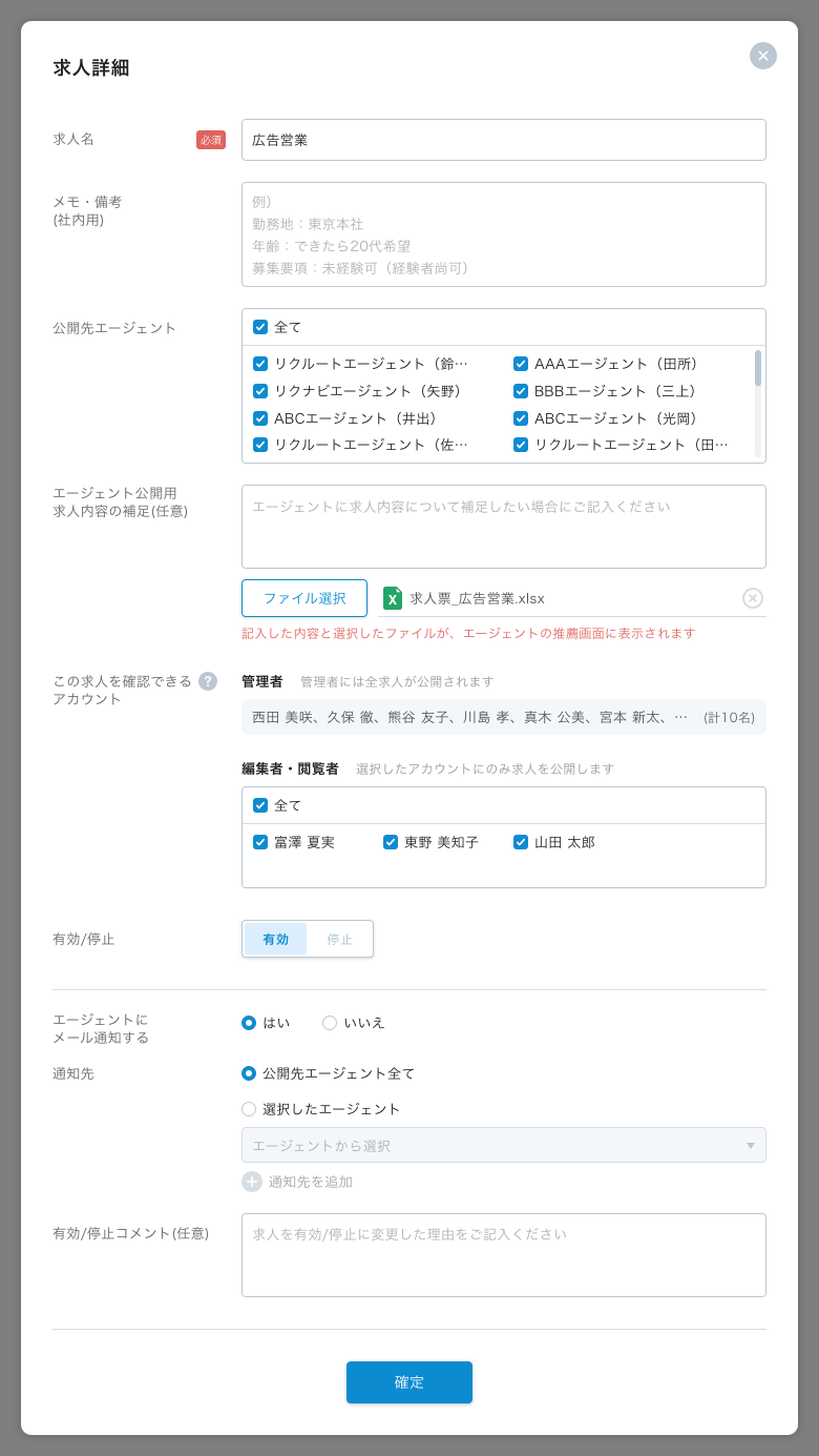 ・登録したエージェントへ一斉連絡が可能。新しい求人の発注、合否通知のやり取の工数が削減