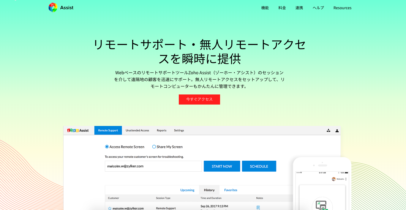 Zoho AssistはWindowsとMacの両方で使える上に、様々な機能やサービスを持ち合わせている高性能なリモートサポートツールです。完全に電源がオフの状態の無人コンピューターを起動させることから始まり、再起動やログオフやシャットダウンまで遠隔操作が可能です。マルチモニターで操作が可能で、ファイル転送やリモート印刷などの活動を、セッション記録を取りながら行うことができます。