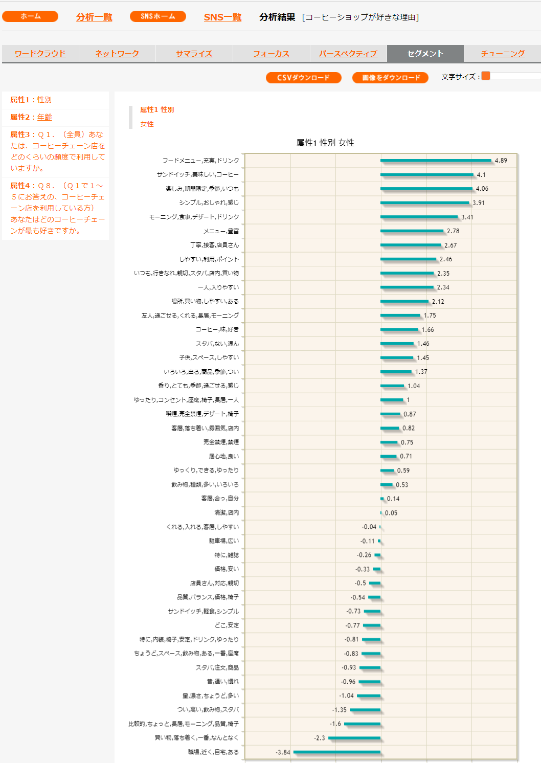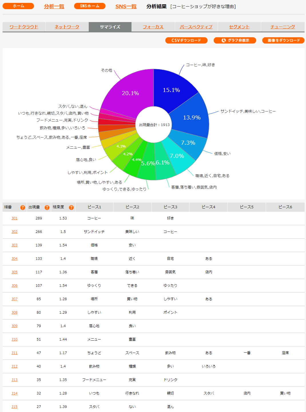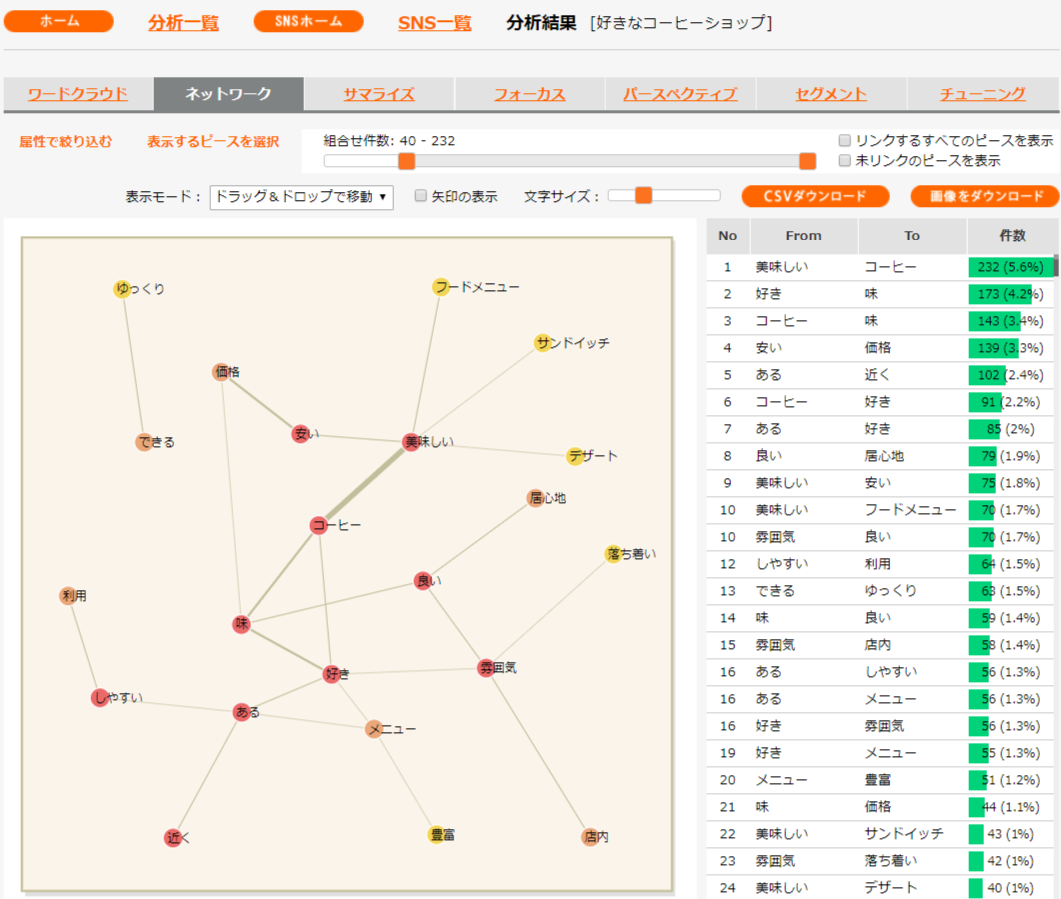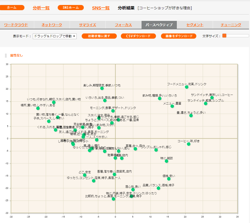 アンケートや日報、問い合わせ履歴など自社で保有する定性データや、SNS(Twitter/Instagram)上のお客様の生の声をテキストマイニングにより分析し、課題やニーズの発見にご活用いただけます。