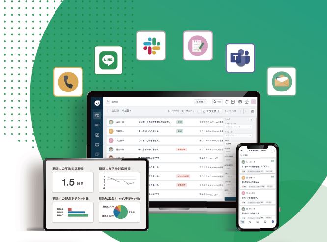 メール、電話、フォーム、LINEやSlack、Teamsなどを一元管理。