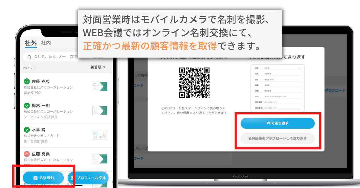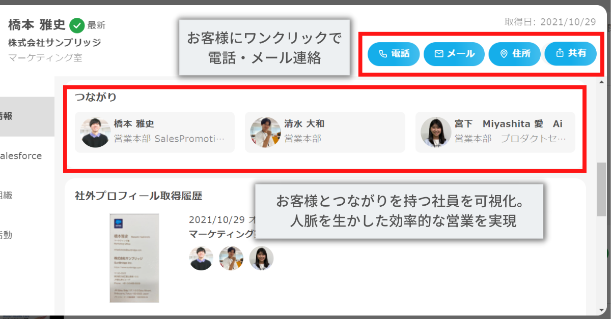 Web電話帳機能により、名刺を取り込んでおくだけでお客様や社内からの着信も一目瞭然。電話の取り逃し防止はもちろん、スムーズな会話も可能になります。