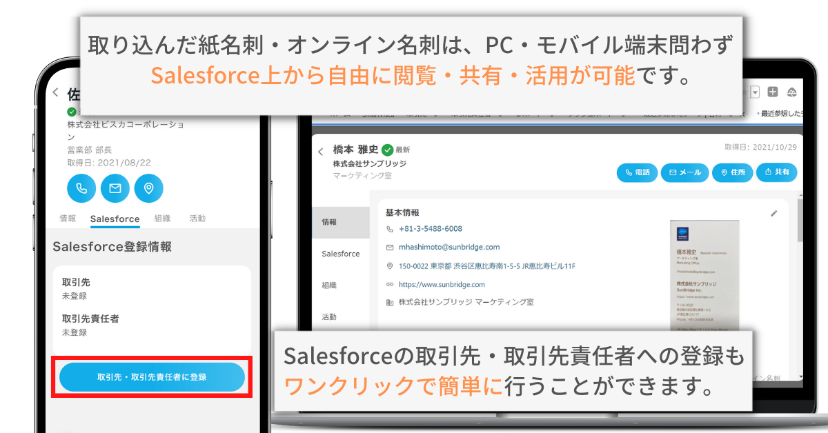Salesforceに登録済みのリードや取引先責任者情報を取り込めるため、二重入力の手間を省き、名刺取り込み作業を迅速化できます。また、取り込んだ名刺情報をデータ化し、Salesforce上で効率的に活用する方法を提案してくれます。データ化された名刺情報は、Salesforce上で検索したり、リードへ登録したりするなど、様々な使い方が可能です。