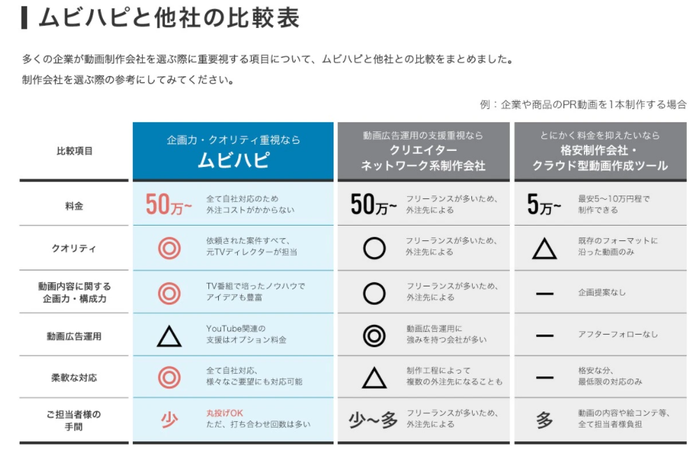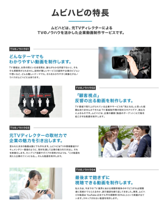私たちムビハピは、TVで培ってきたノウハウを元に、動画を見せるターゲットの理解や共感を得て、行動を起こさせる動画を制作します。