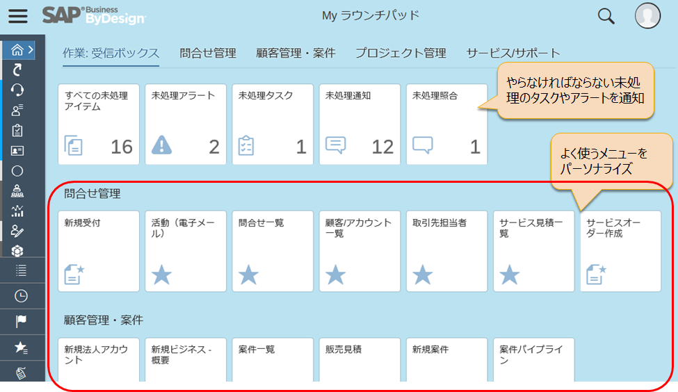 SAP Business ByDesign®のワークセンター(メニュー)イメージ
