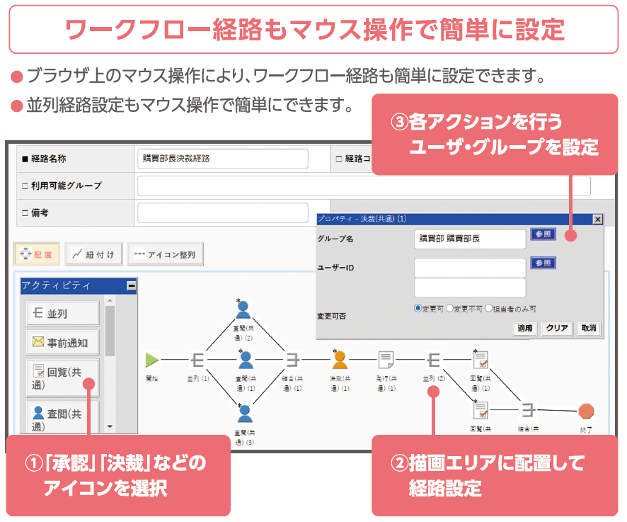 承認ワークフロー機能も標準搭載し、柔軟な経路設定が可能なため稟議書などの申請業務にも利用できます。