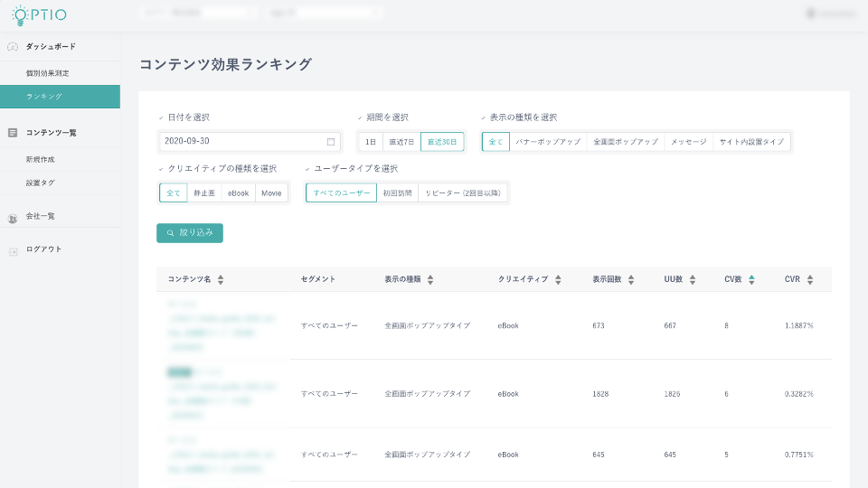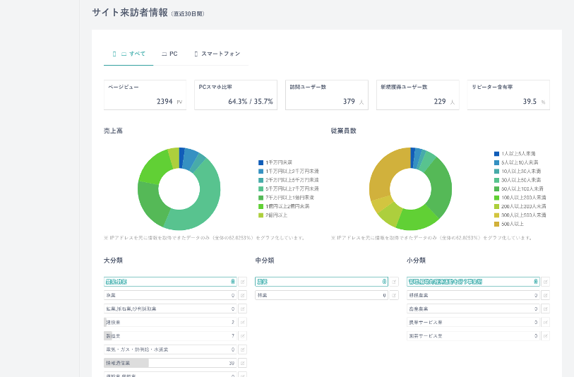 OPTIOで獲得できたコンバージョン数やサイト来訪者数、来訪企業規模や業種カテゴリーの可視化が可能です。この数値をもとに配信ターゲットを設定しコンバージョン数向上を目指します