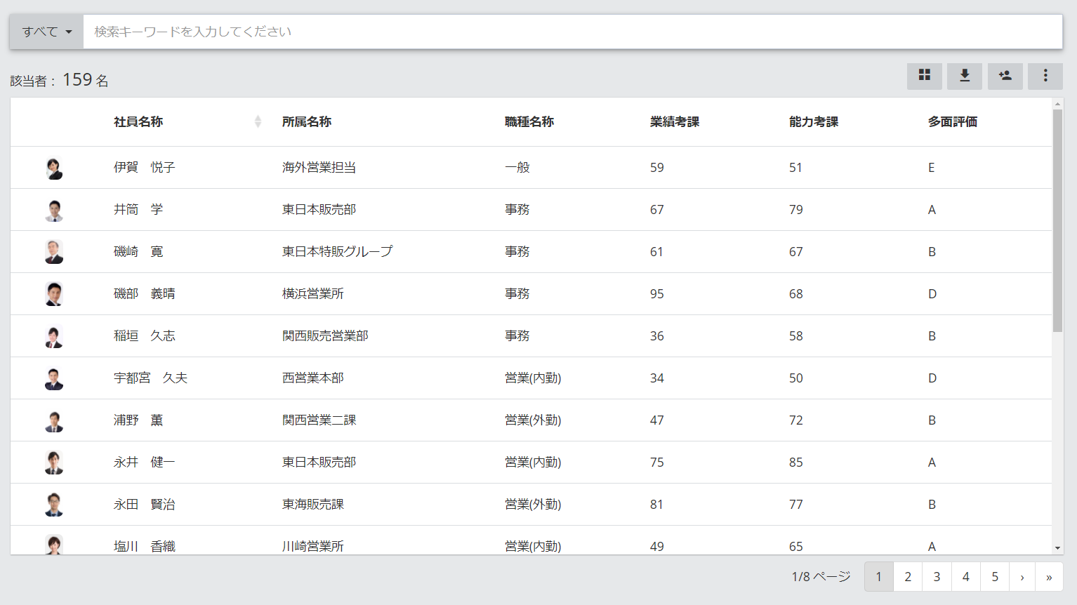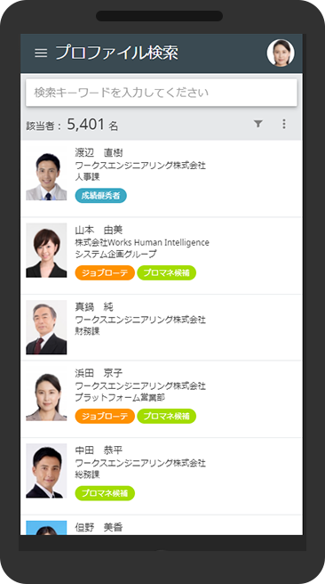 会社・所属・役職・勤続年数・資格・スキル・評価などを用いた絞り込み検索に対応。絞り込み条件に利用する項目は自由に選択可能。