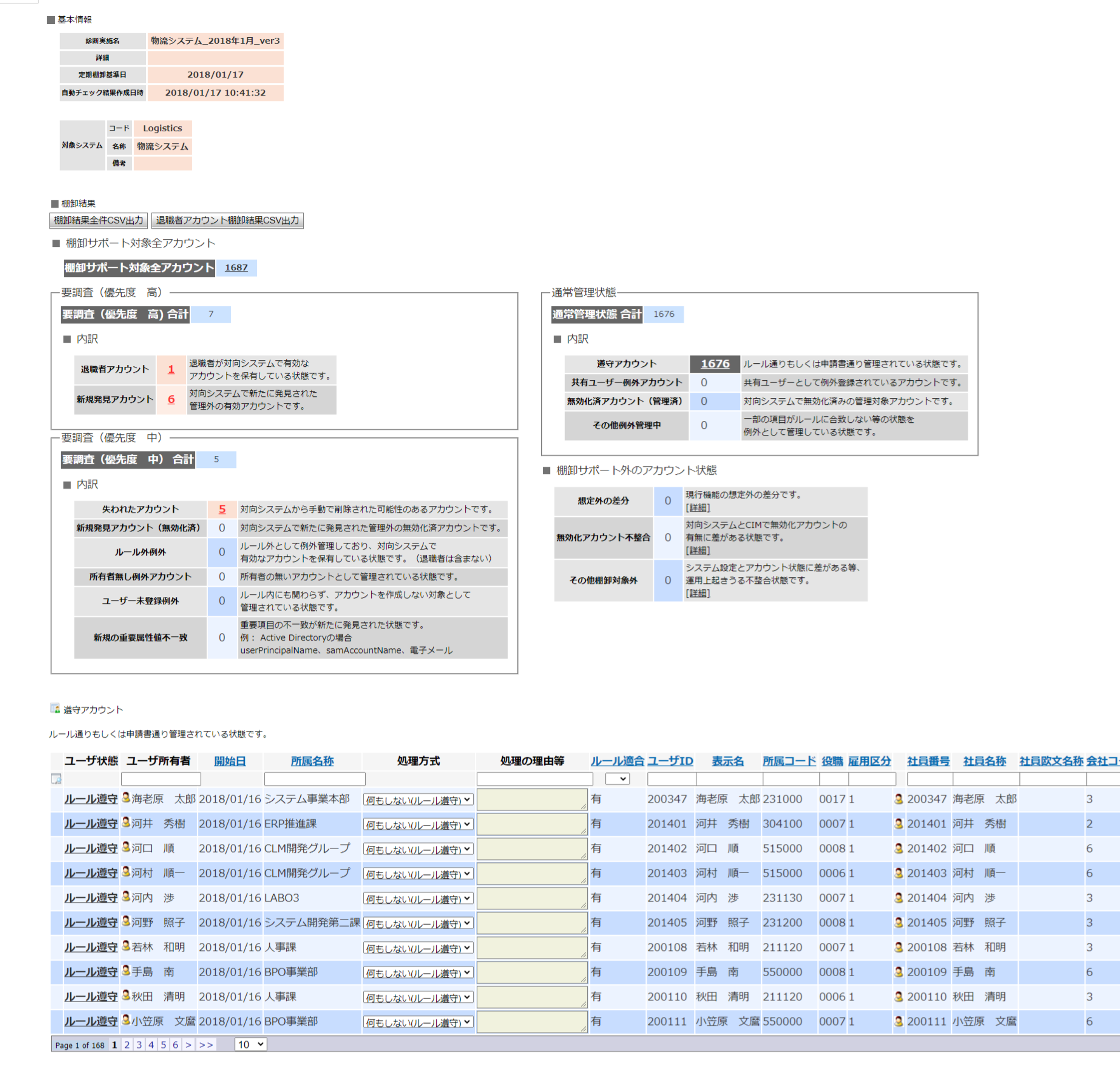 退職済みの元社員アカウントや、一時的対応で現場システム上だけに作成された臨時アカウントが放置されていないかをシステムが洗い出し、管理者に確認依頼が可能。