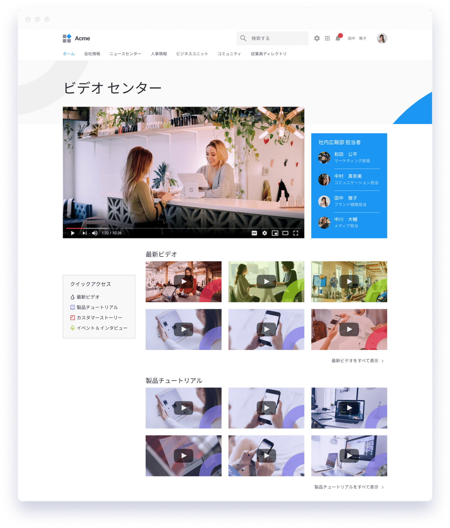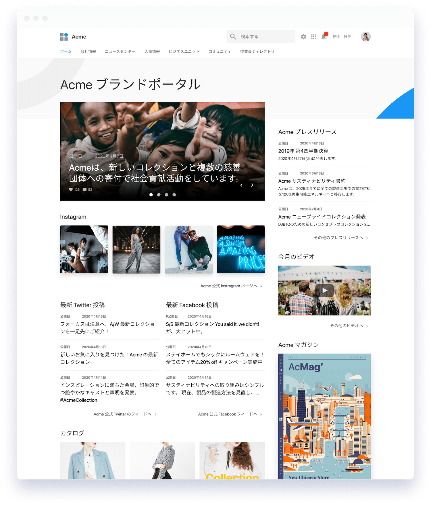 レスポンシブデザインでスマートフォンでの操作に対応し、社内外から必要な機能および情報へすぐにアクセスできます。複数システムに保管された資料や新着メッセージの確認をLumAppsで操作することができ、社内コミュニケーション、情報収集、業務スペースのハブとなります。