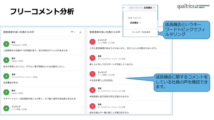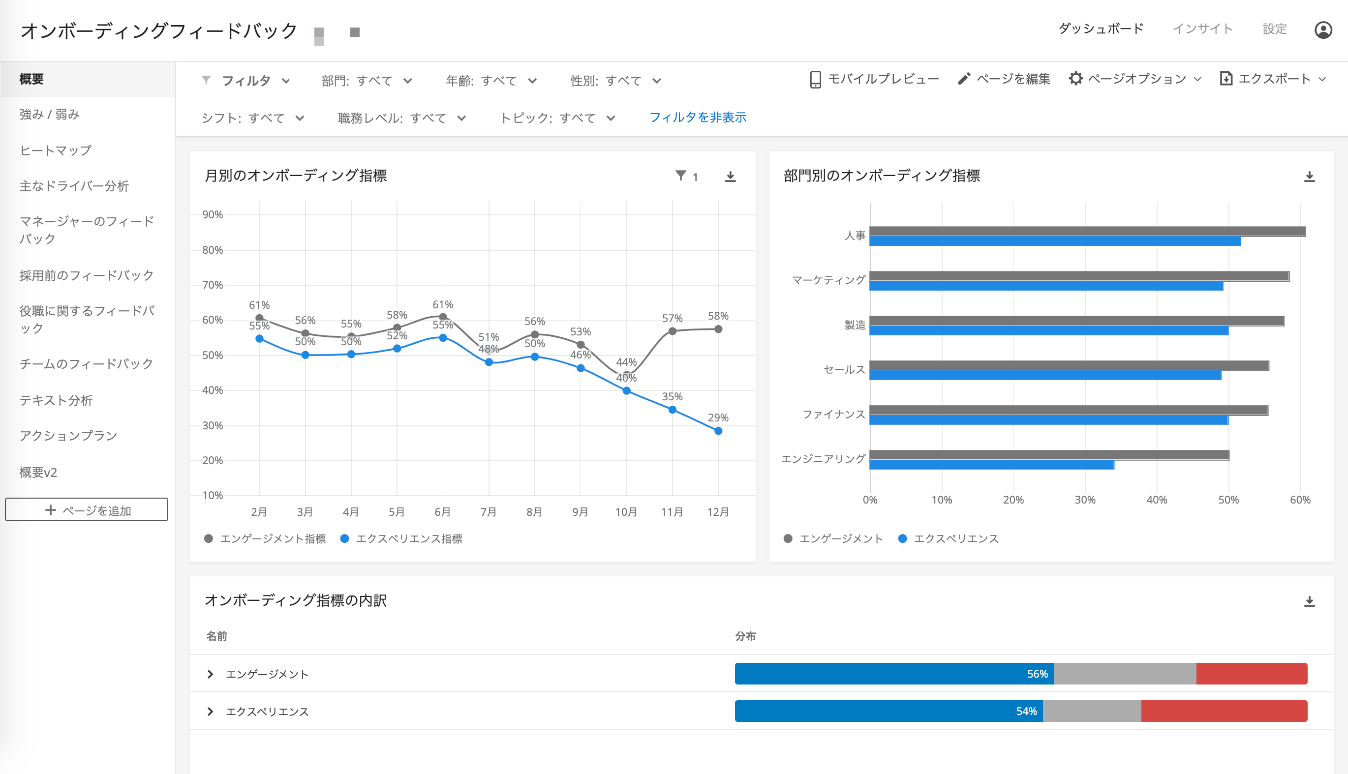 ・データ相関分析: 従業員の体験データと、CRM/ERPなどの業績データや顧客体験データを組み合わせ、離職率や生産性への影響を科学的に分析します。