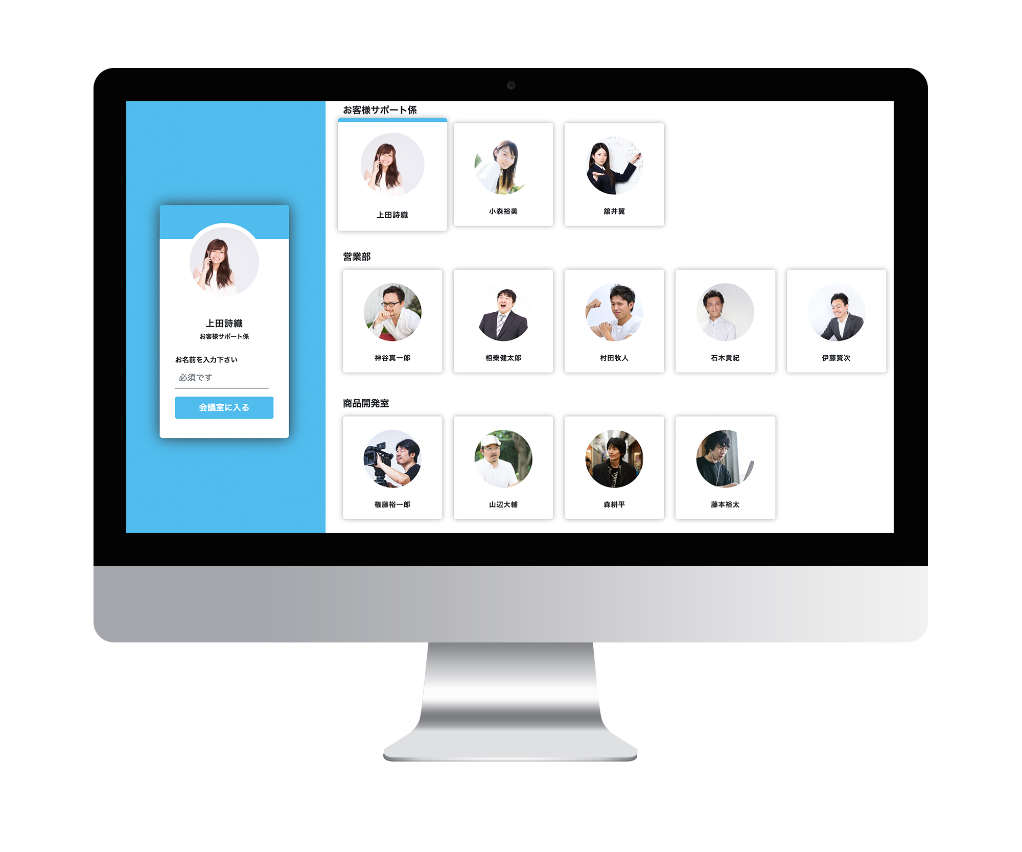 まるで会社の受付のように担当者を指定して即接続できる「バーチャルエントランス」機能を標準装備!エントランスはカスタマイズもできる!