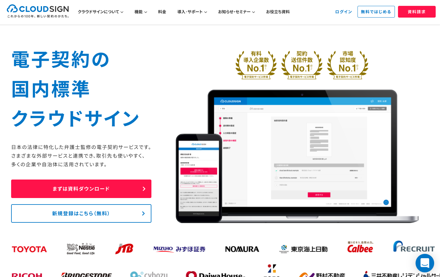 【クラウドサイン】は「印鑑レス」&「ペーパーレス」な取引を実現する電子契約サービスです。累計契約送信件数3000万件超の実績!(2025年7月時点) <何ができるのか?> 今、印鑑を押す必要があるために「ペーパーレス化」できずにいる契約書類や、申込書・発注書などを完全にデジタル化することができ、業務効率の改善や生産性の向上、印鑑の無断利用や偽造、紛失・破損などのリスク回避が可能となります。 ・コスト削減 電子契約は印紙不要。「紙」「郵送費用」も必要なくなります。 ・無駄な作業の削減 プリントアウト、製本、押印、封入、郵送、回収の手間が不要に。 PDF書類をクラウドサイン上にアップロードしてメールアドレスを指定して送信するだけ。 送った書類は、クラウド上に保管されているため「検索」や「状況の可視化」も可能です。 ・回収速度UPによる「収益化サイクル」の加速 紙に押印して郵送しあう方式では、最短でも数日。長くかかると1ヶ月ほどかかる場合もあります。 クラウドサイン上で締結される書類の6割は24時間以内に双方合意の上、回収完了しています。 例えば営業が受注してから契約書類を回収するまでのリードタイムが最短数分まで短縮されます。 ・保管、管理、共有の利便性 「あの契約書、どうなったっけ?」「前の契約時の条件を見たい...」など契約書を確認したい時の手間を削減できます。クラウドサインで締結した書類は、クラウドサイン上に自動で保管されるため、いつでも検索可能。締結時にCC機能を使えば、営業担当者が対応中の発注書を取引先が「合意締結」したタイミングで管理部担当者にも通知を飛ばせるなど、情報共有の手間や抜け漏れも回避可能です。 その他、「デジタルだからこそ可能」な便利機能がたくさんあります。 こんなことできないの? 他社の活用事例は?など、お気軽にお問い合わせください。
