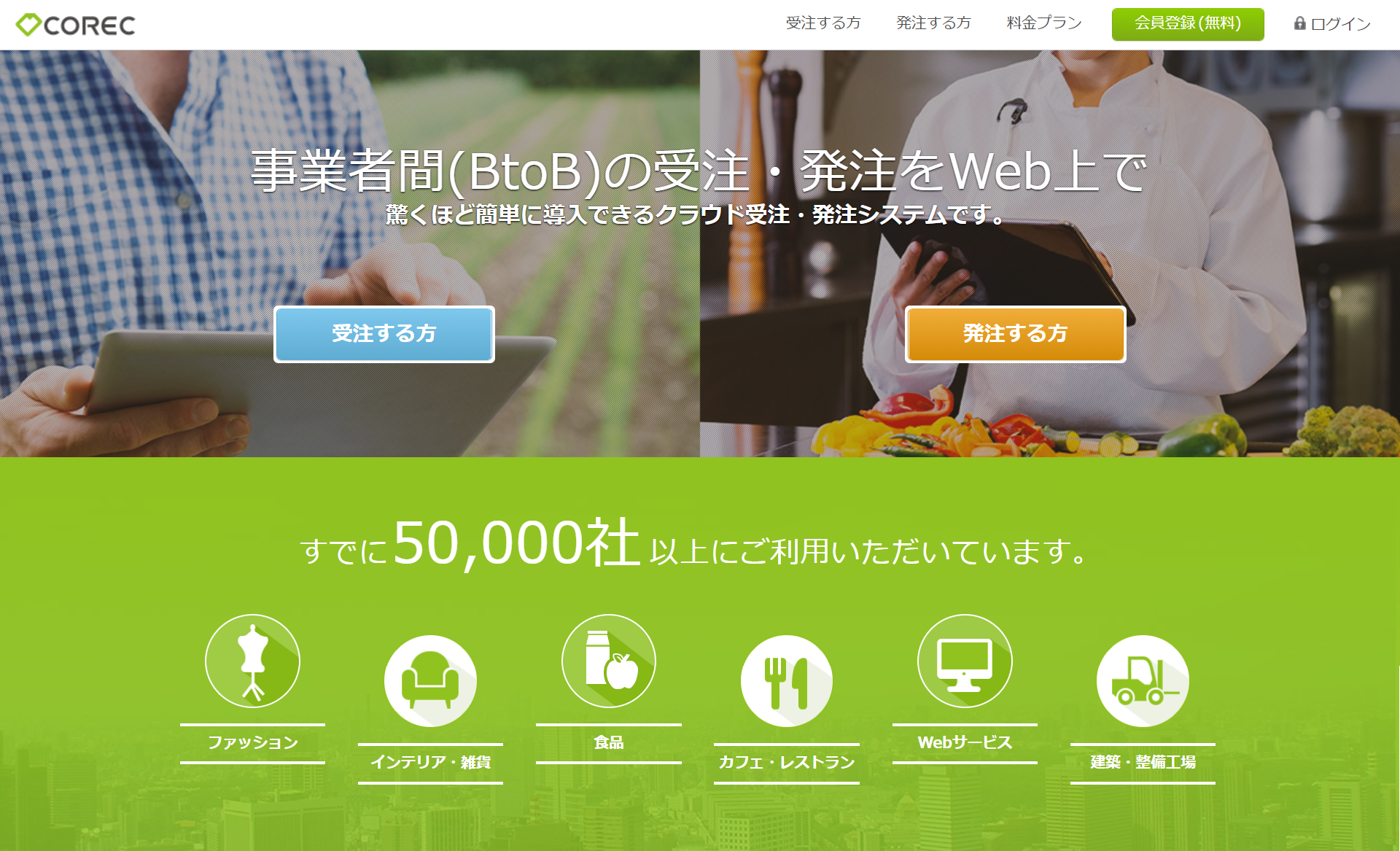 CORECはWeb上の簡単な登録だけで、驚くほど簡単に導入できるクラウド受注・発注システムです。事業者間(BtoB)の受注・発注2つの機能をWeb上で使えるため、幅広い業種で50,000社が利用しています。Webで一元管理することで受注処理の手間とコストを削減でき、スタッフ間や店舗間で仕入れや購買についての管理や共有がスムーズになります。