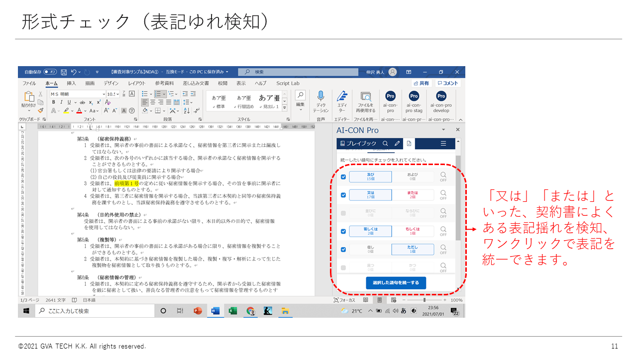 表記ゆれや条番号のずれ、引用条項の抜けなどを自動で検出し、ワンクリックで一括修正が可能。形式チェックにかかっていた時間を削減し、実質的な法務判断にリソースを集中できます。