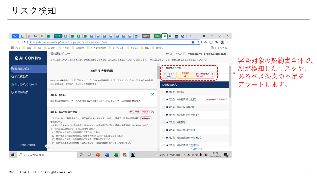 リスクをAIが見つけてくれて、条項考える際にすぐ案を見られる。書籍を開かずに契約書レビューがある程度完結するようになって、時短がかなりできました。