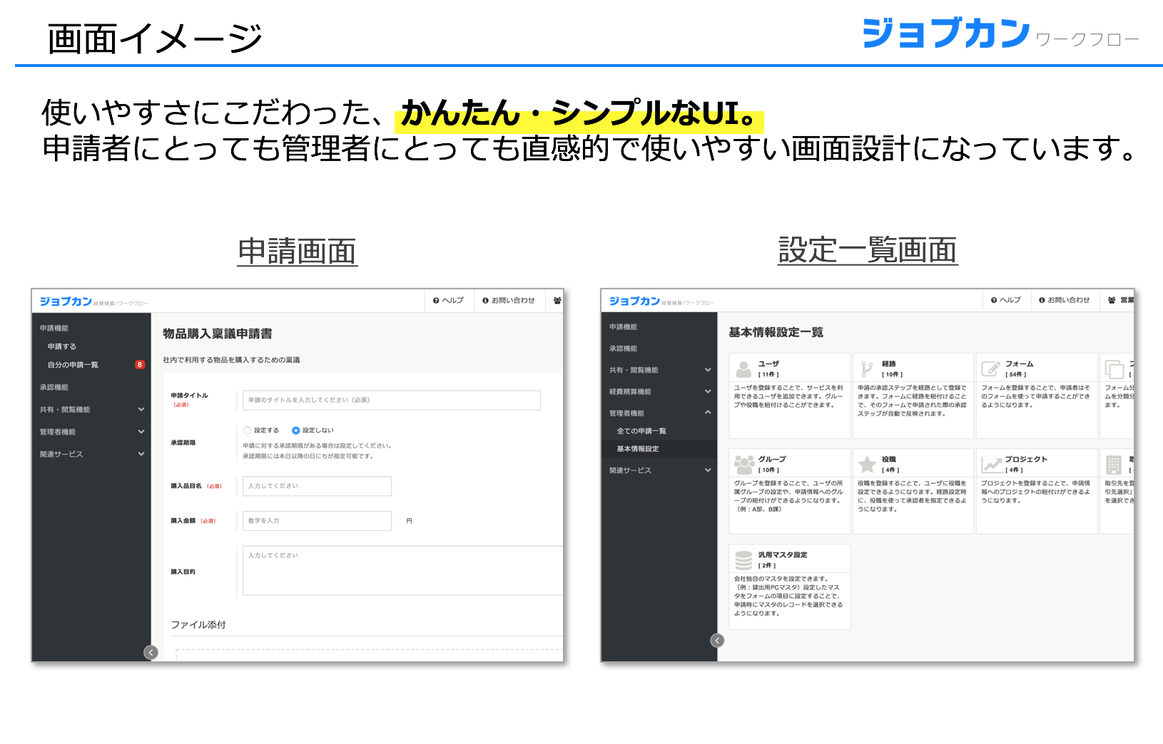 必須項目設定や桁数設定など、申請不備を解消する仕組みがたくさんあります。