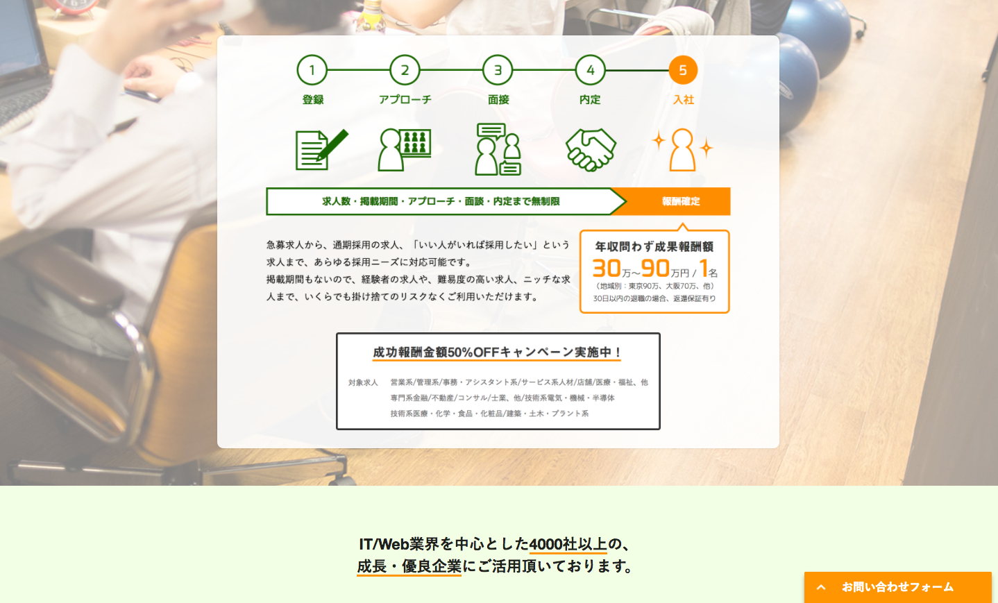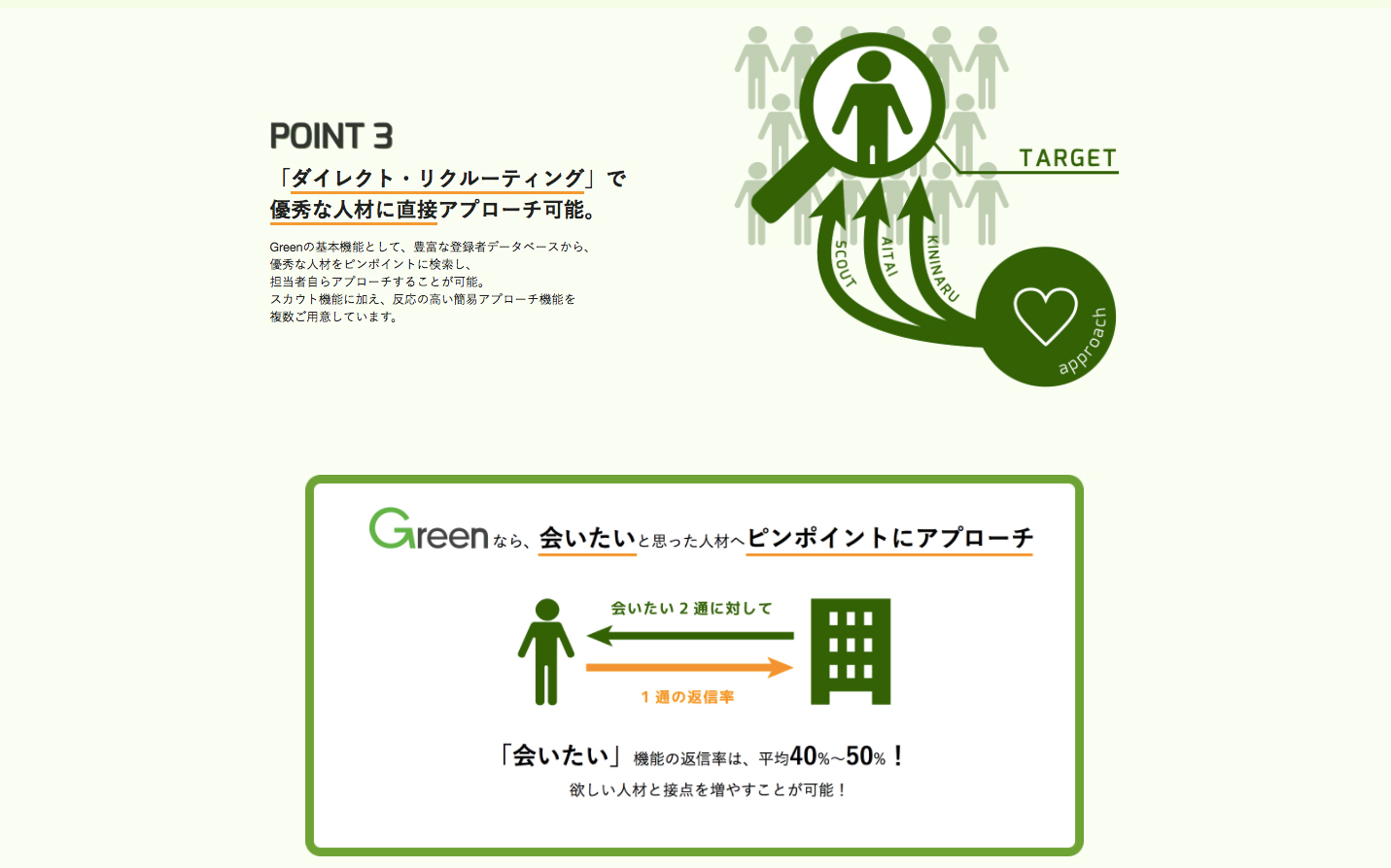 Greenは、IT/web業界・ベンチャー企業の経験者採用に強い成功報酬型の求人メディアです。 2017年現在、4500社以上の優良企業・成長企業様にご活用いただいております。 求人の掲載期間や求人数は無制限、またアプローチ機能も無制限で利用することができます。 また成功報酬費用は30〜90万円で、経験者エンジニアやデザイナーを初めITリテラシーのある営業職、webマーケターといったIT系の即戦力人材の採用に特化しています。 2006年のサービス開始依頼、4500社以上の成長を見てきたGreenなら、お役に立てるかもしれません。気軽にお問い合せくださいませ。