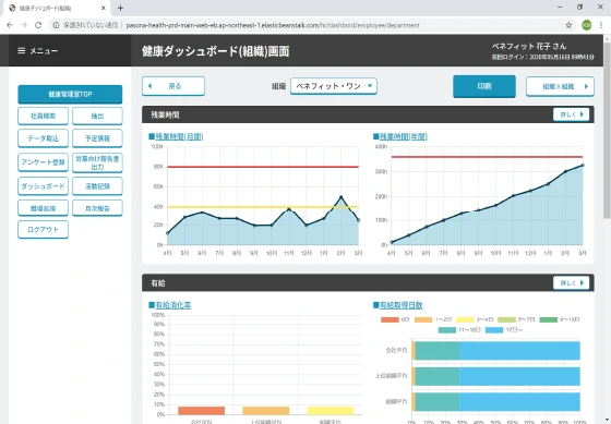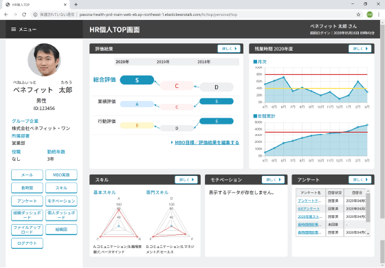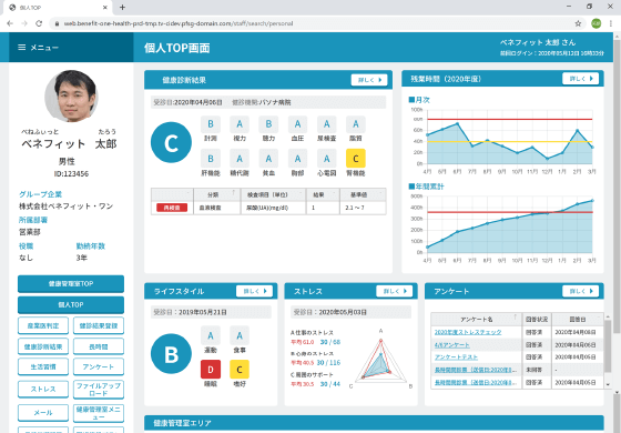 ベネワン・プラットフォームは、人事や健康に関するデータを一元管理できる健康管理システムです。従業員の基本情報、労働時間、スキル、業務に対するモチベーションなどのHR情報や、健康診断の結果、ライフスタイル、ストレスチェックなどの健康情報を集約し、可視化することで、個々の従業員に最適なマネジメントを行うことができ、生産性や業務モチベーションの向上、離職率の低下に寄与することが期待されます。