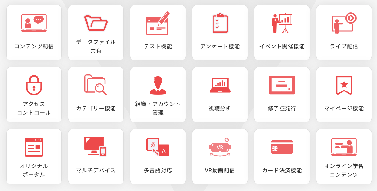 動画コンテンツの配信という基本機能に加え視聴管理、オンラインテスト、デジタル認定証、eラーニングコンテンツ販売、ライブ配信、グループウェアなど便利な機能が標準で装備されています。貴社の要望に合わせたオリジナル動画LMSシステム開発受託も可能。