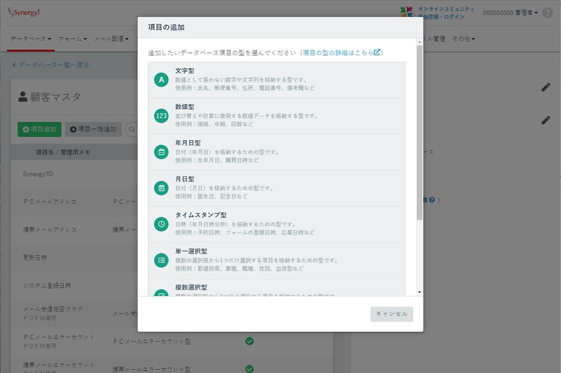 A Synergy! は、顧客データベースを中心にメール配信・LINE配信・フォーム・アンケート・問い合わせ管理・Webコンテンツの出し分けなどを一体で扱えます。 顧客情報の一元管理に加えて、集客・顧客育成・リピーター化・休眠顧客の掘り起こしなど、マーケティング活動全体の設計と実行までSynergy!上で完結させられます。Q すでに保有している基幹システムやデータベースとSynergy!を連携できますか?