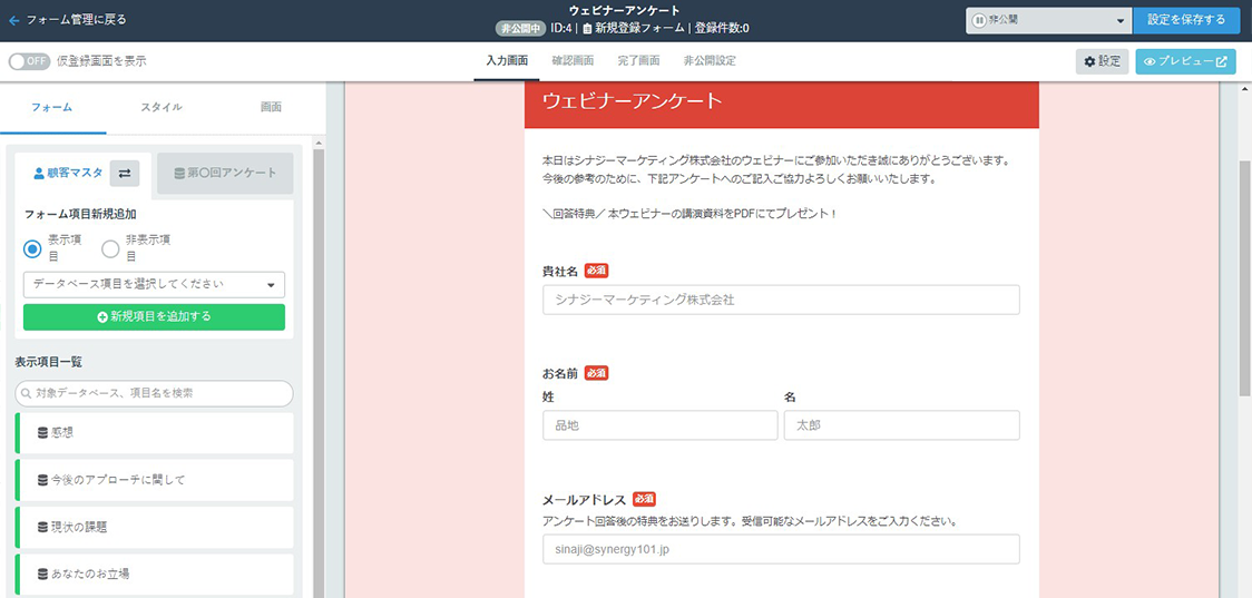 また、作成したフォームから取得した顧客情報はリアルタイムでSynergy!のデータベースに蓄積されるため、フォーム経由のデータ管理や活用も手間なく行えます。