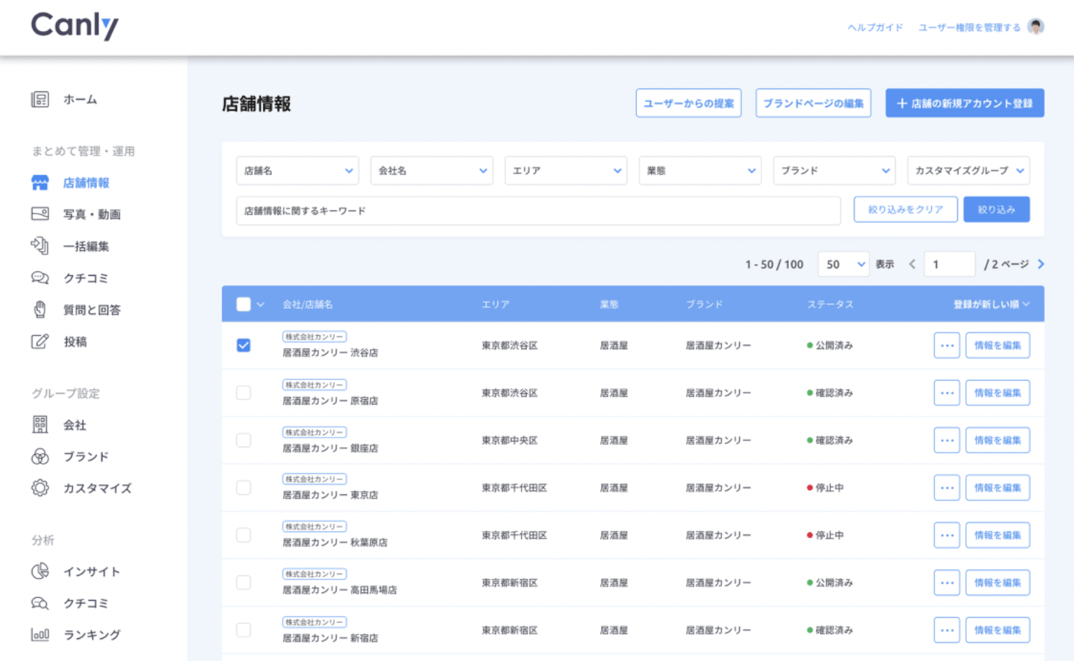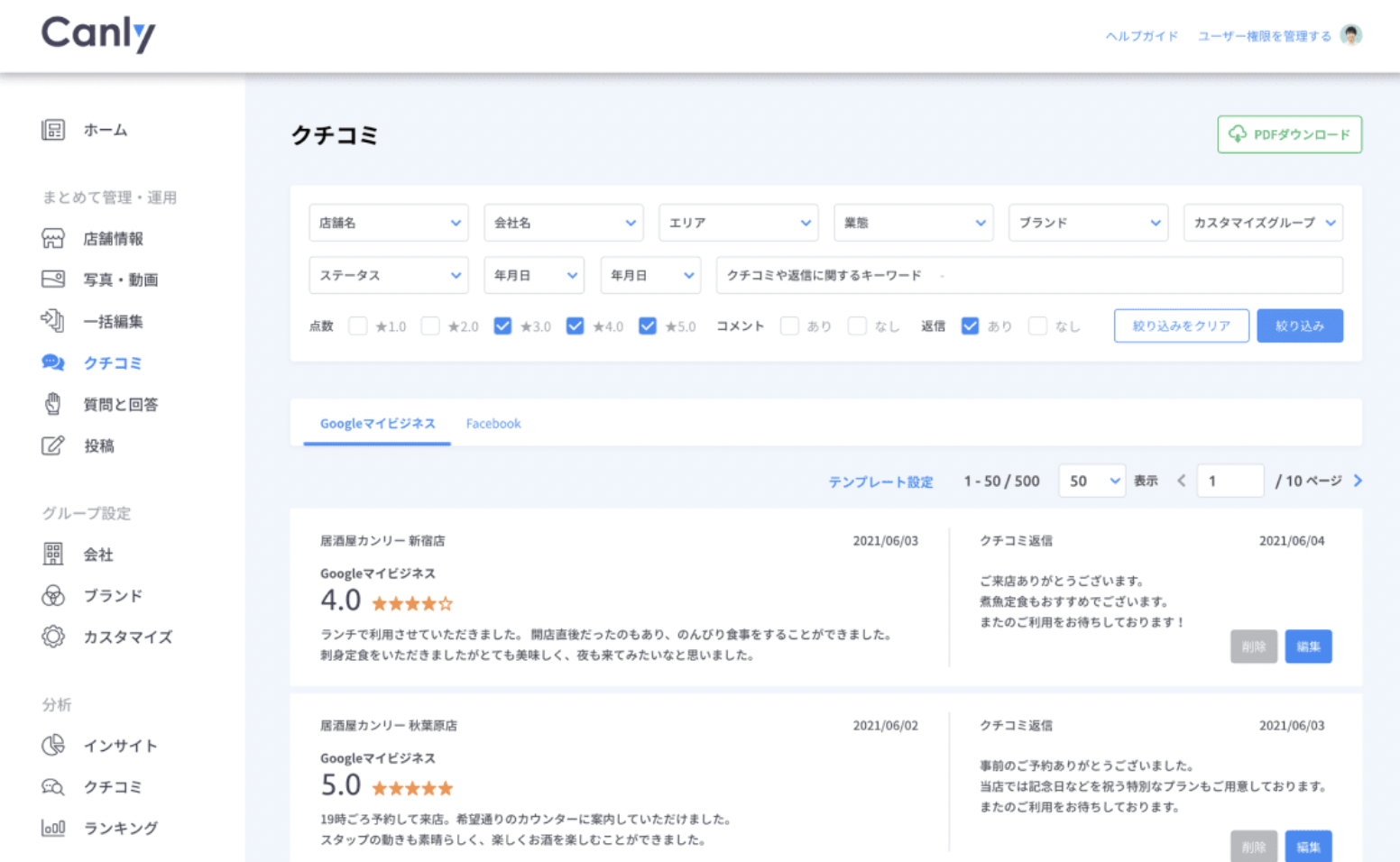 Canlyは、Googleマイビジネスや各SNSの店舗アカウントを一括管理することで、管理・運用コストの削減、データ分析により店舗運営上の課題を特定し施策の改善につなげる店舗管理クラウドサービスです。