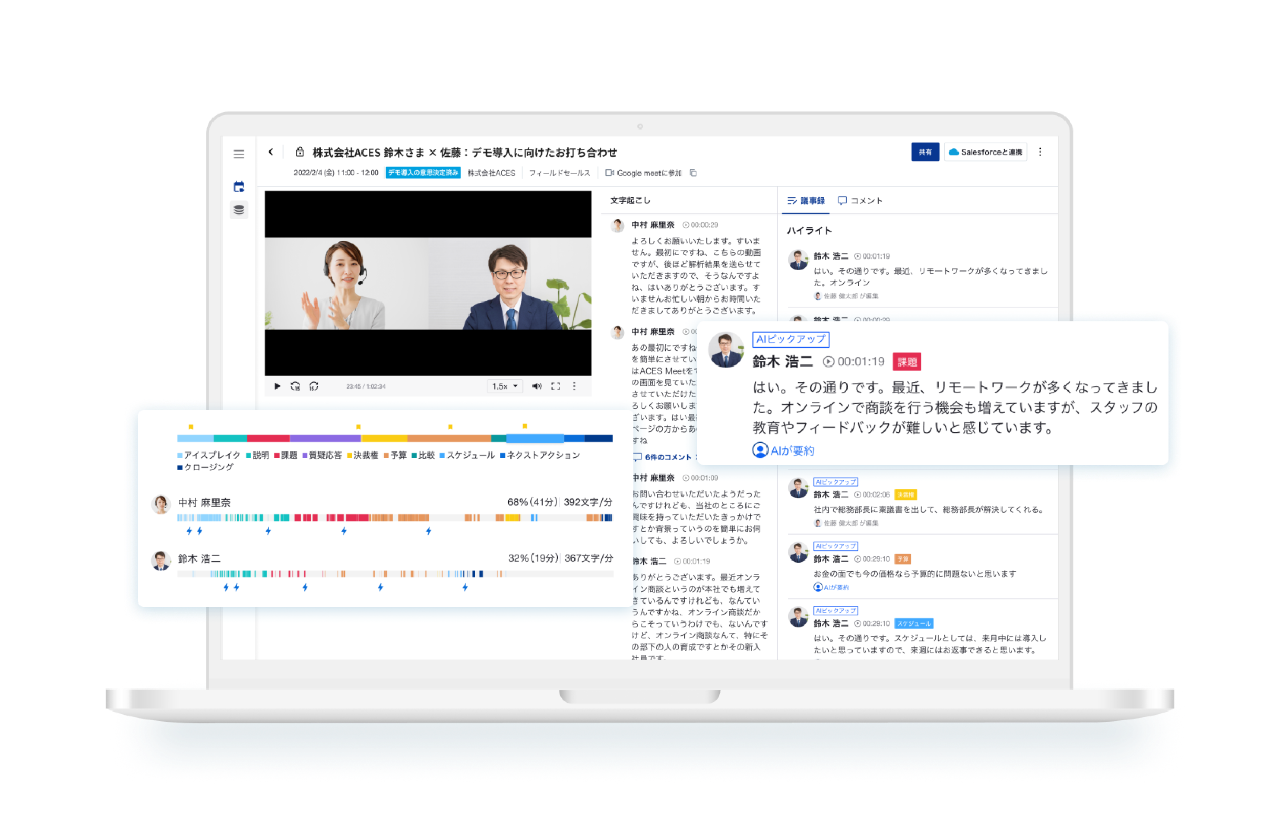 Web会議の商談をAIが自動で解析し、文字起こし、要約、話速、沈黙時間、顧客の反応など、詳細なデータを可視化してくれる点が素晴らしいです。
